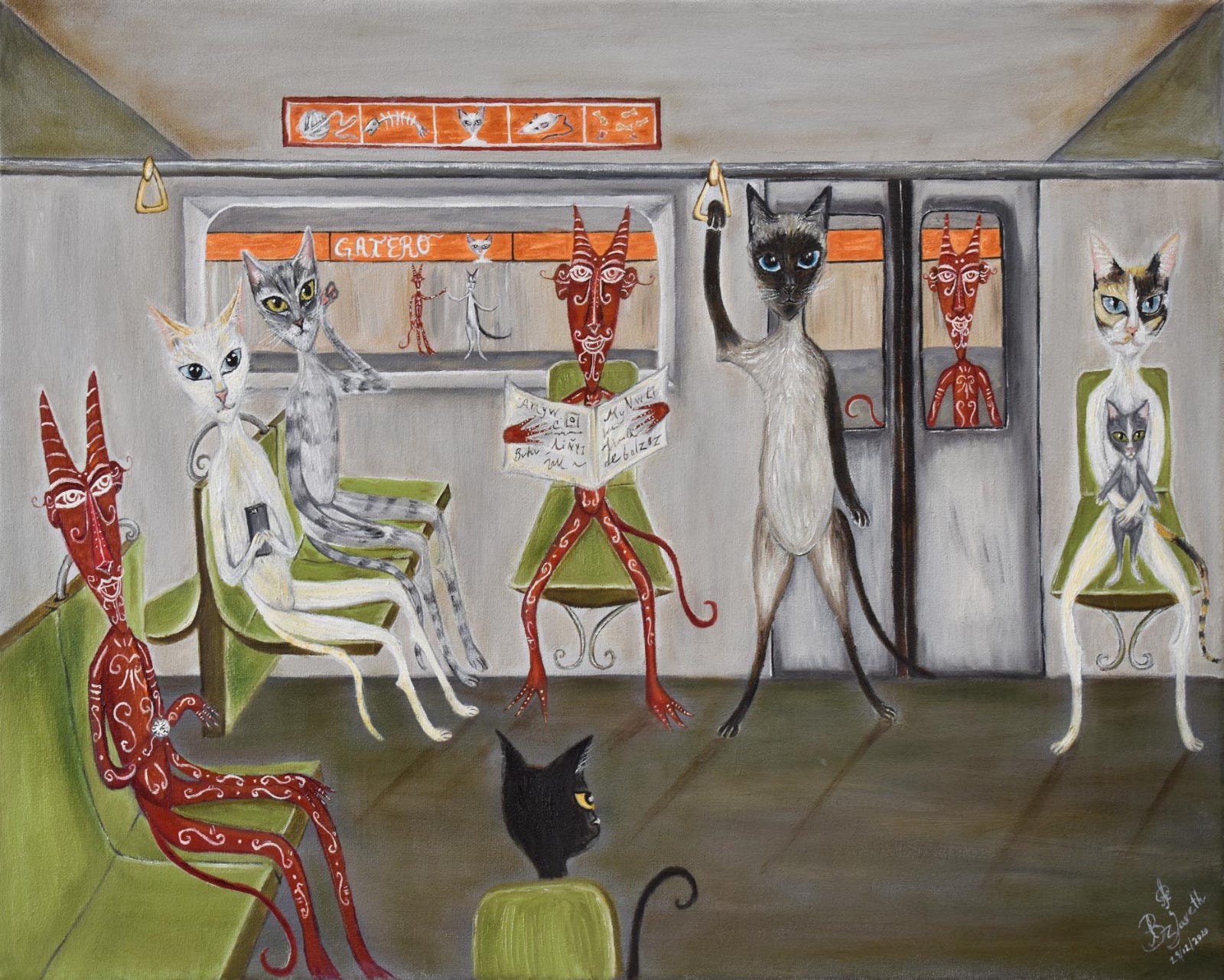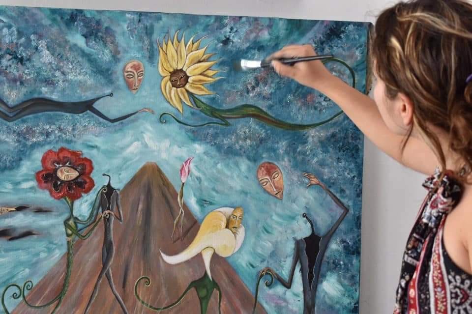 B: Mi proceso creativo es curioso, llegan a mi mente imágenes a las que llamo revelaciones del inconsciente, aparecen visiones y comienzo a darles forma en mi cabeza y cuando están listas comienzo a dibujar bocetos para después plasmar las ideas en un lienzo. La mayoría de veces las vislumbro otra van apareciendo de forma automática mientras dibujo.