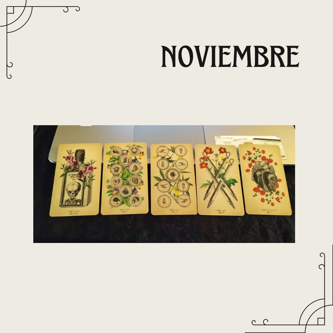 La Sota de copas, viene a marcar el tono y el tema general de la tirada, esta carta nos dice que durante el mes de noviembre nuestro enfoque debe recaer en nuestras relaciones personales, estamos hablando de familia y amigos va a ser muy importante revisar cuales son las relaciones que realmente nos enriquecen según el 10 de oros, las relaciones que son reciprocas y que nos alimentan y engrandecen, quienes nos suman; por otro lado el 9 de oros nos recuerda que nosotros también debemos poner ese esfuerzo y esa inversión de tiempo (o recursos) las relaciones no las carga solo una persona es una simbiosis, el 4 de bastos nos regresa a las relaciones familiares, sobre todo las de familia directa y matrimonio si es el caso y por último cierra el arcano mayor número 6 Los Enamorados/ Amantes, si recordamos este arcano no solo nos habla de amor entre 2 personas , pero en la vida nos habla de decisiones importantes que hay que tomar para seguir con nuestro camino de evolución.
