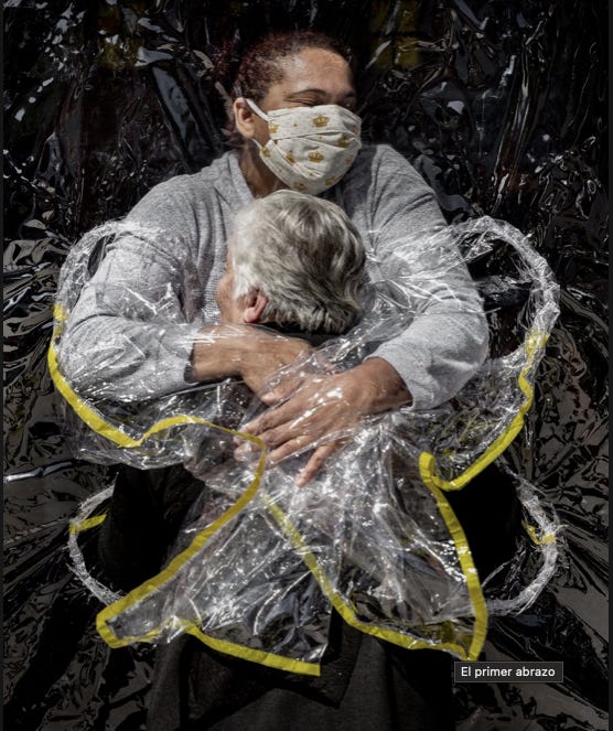 La fotografía titulada “El primer abrazo” fue tomada en São Paulo, Brasil en agosto de 2020. Después de 5 meses de encierro en el hogar de ancianos (como resultado de la pandemia de COVID-19) Rosa Luzia Lunardi de 85 años abraza a la enfermera Adriana Silva da Costa Souza.