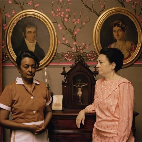 Casa de Mujeres and La Negra: In these photographic series, Mozman Solano’s mother takes on a range of roles that examine the intersections of gender, race, and class in Panama. The pieces delve into the social hierarchies rooted in skin color and colonial ancestry.