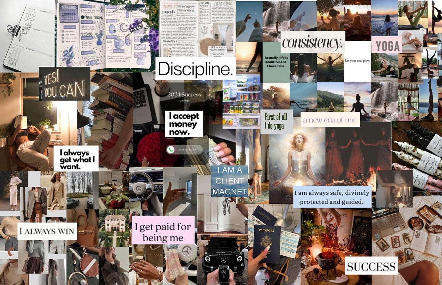 Un vision board es un collage visual compuesto por imágenes, palabras, frases o símbolos que representan lo que deseas manifestar en tu vida. Funciona como un recordatorio diario de tus metas y aspiraciones, ayudando a programar tu mente para atraer esas experiencias a tu vida. La idea central es que, al concentrar tu atención en lo que deseas, comienzas a alinearte emocional y energéticamente con esas metas.